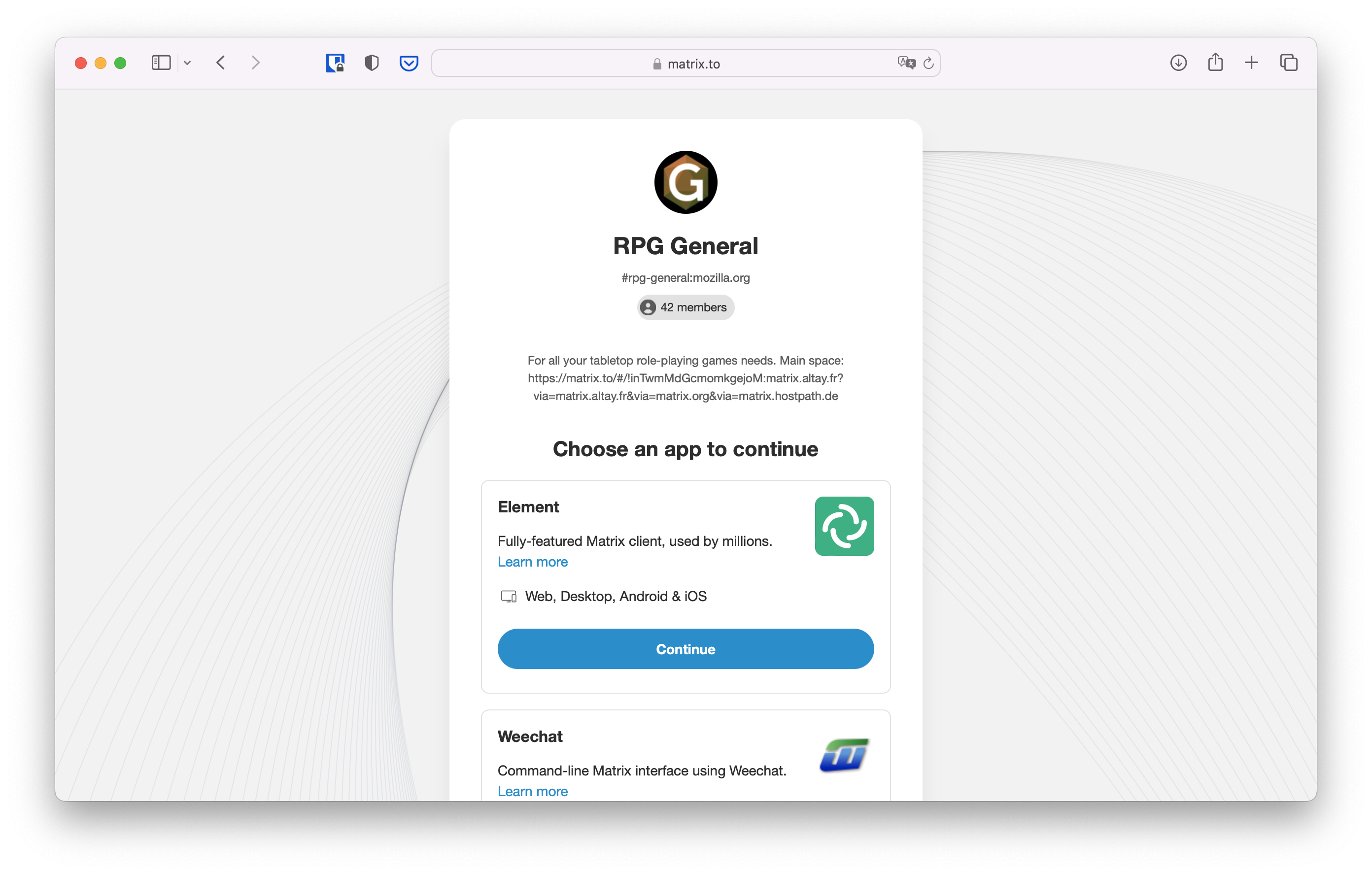 Click on “Continue” below Element. If you have installed Element Desktop, your browser may ask you if you want to allow this page to open Element. Click on Allow. If you haven’t installed Element Desktop, you can either click on “Download” to get it, or “Continue in your browser” to carry on with the web app.
