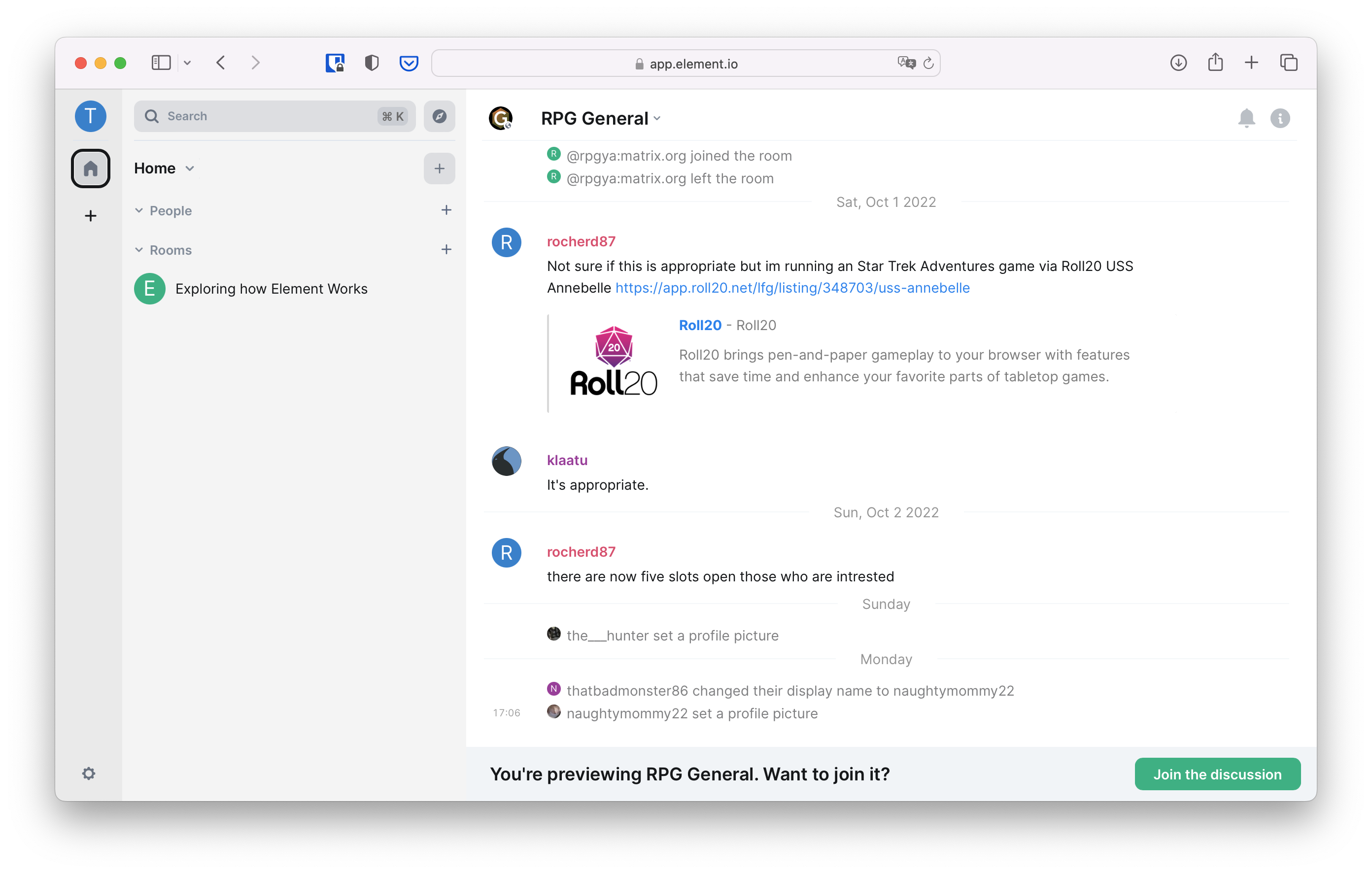 Once you have joined a Space, clicking on its icon on the leftmost bar will bring you to the index view of the space: you will see all the rooms contained in this space, and you will be able to join them by clicking on “Join”.